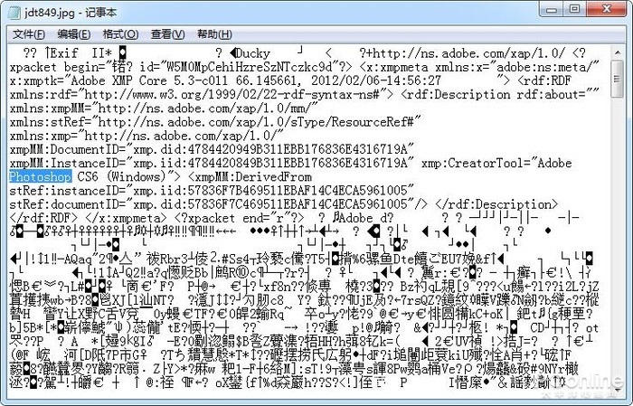 ▲ 用記事本打開圖片文件,有 “Photoshop”字樣,說明這是一張用 PS 保存的圖片