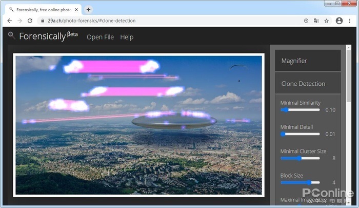 例如,F(xiàn)orensically 的 “Error Level Analysis”功能,可以突出顯示某些肉眼看上去差不多、但從計算機角度來看非常突兀的像素。例如這張示例圖中的飛碟,就很顯眼了,這明顯就是 P 上去的。